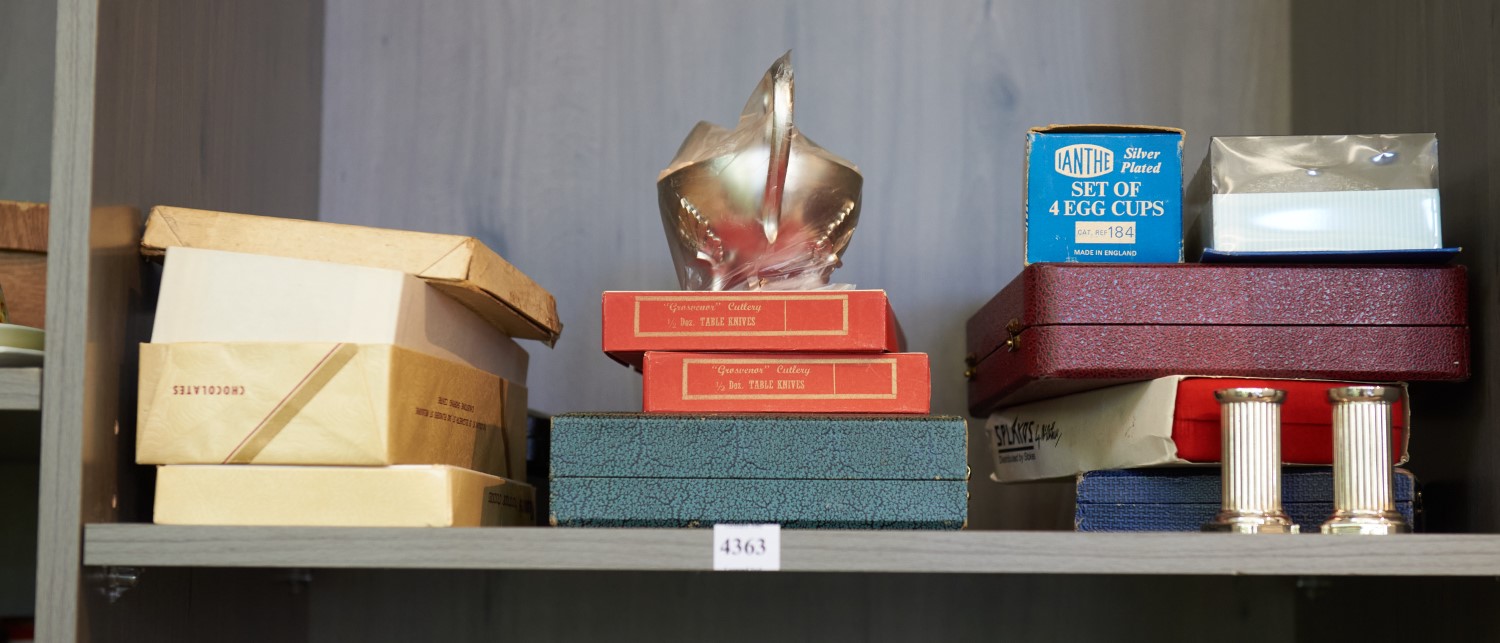 A SHELF OF SILVERWARE, EPNS SPOONS, ETC, LEONARD JOEL LOCAL DELIVERY SIZE: SMALL