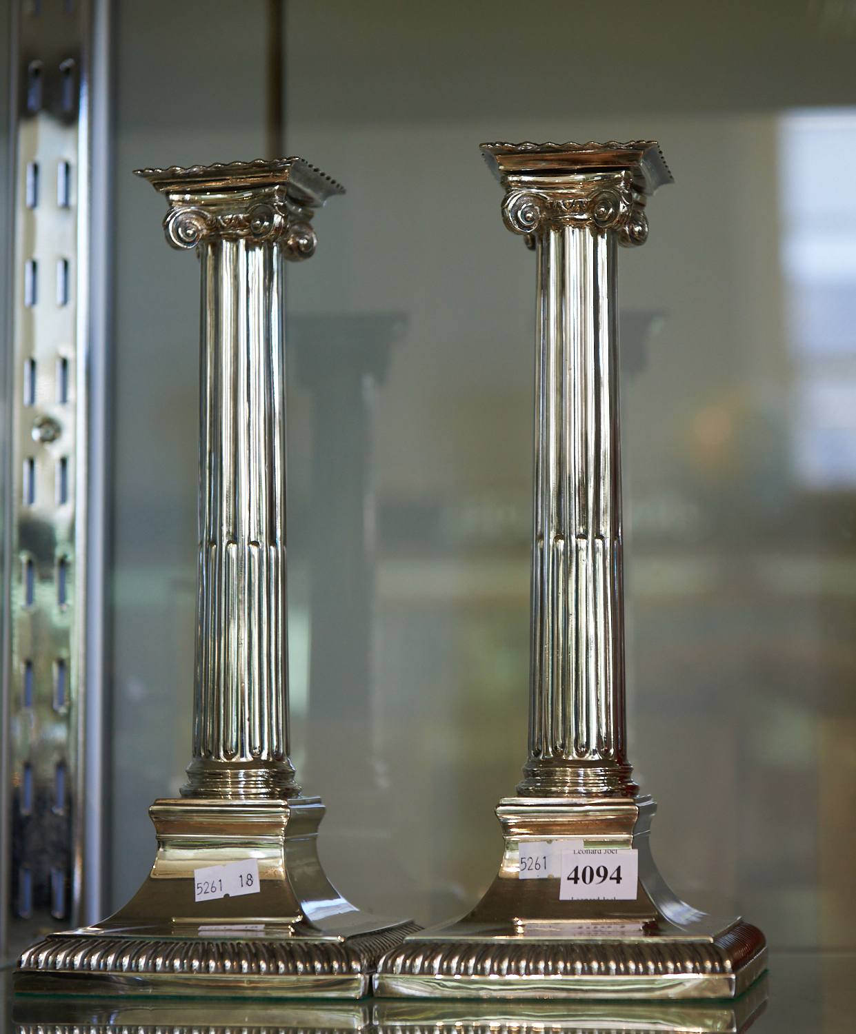 A PAIR OF SILVERPLATE CORINTHIAN COLUMN CANDLESTICKS H.28CM, LEONARD JOEL LOCAL DELIVERY SIZE: SMALL