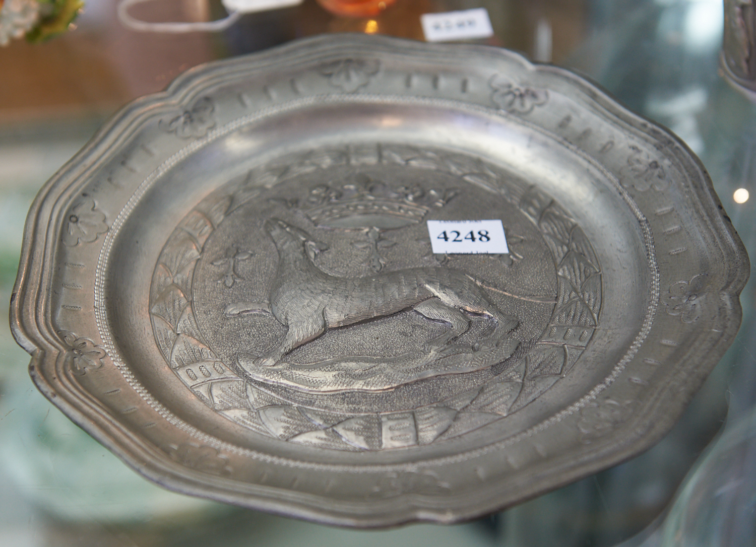 A PEWTER PLATE DIA.23CM, LEONARD JOEL LOCAL DELIVERY SIZE: SMALL