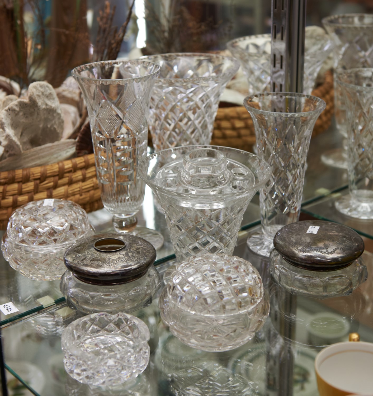 A SHELF OF ASSORTED CRYSTAL INCLUDING VASES AND BOWLS, LEONARD JOEL LOCAL DELIVERY SIZE: SMALL