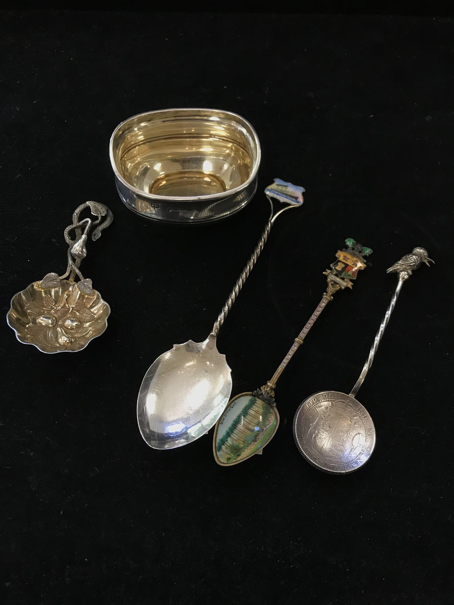 A GROUP OF STERLING SILVER ITEMS INCLUDING FOUR SPOONS AND SALT POT, LEONARD JOEL LOCAL DELIVERY SIZE: SMALL