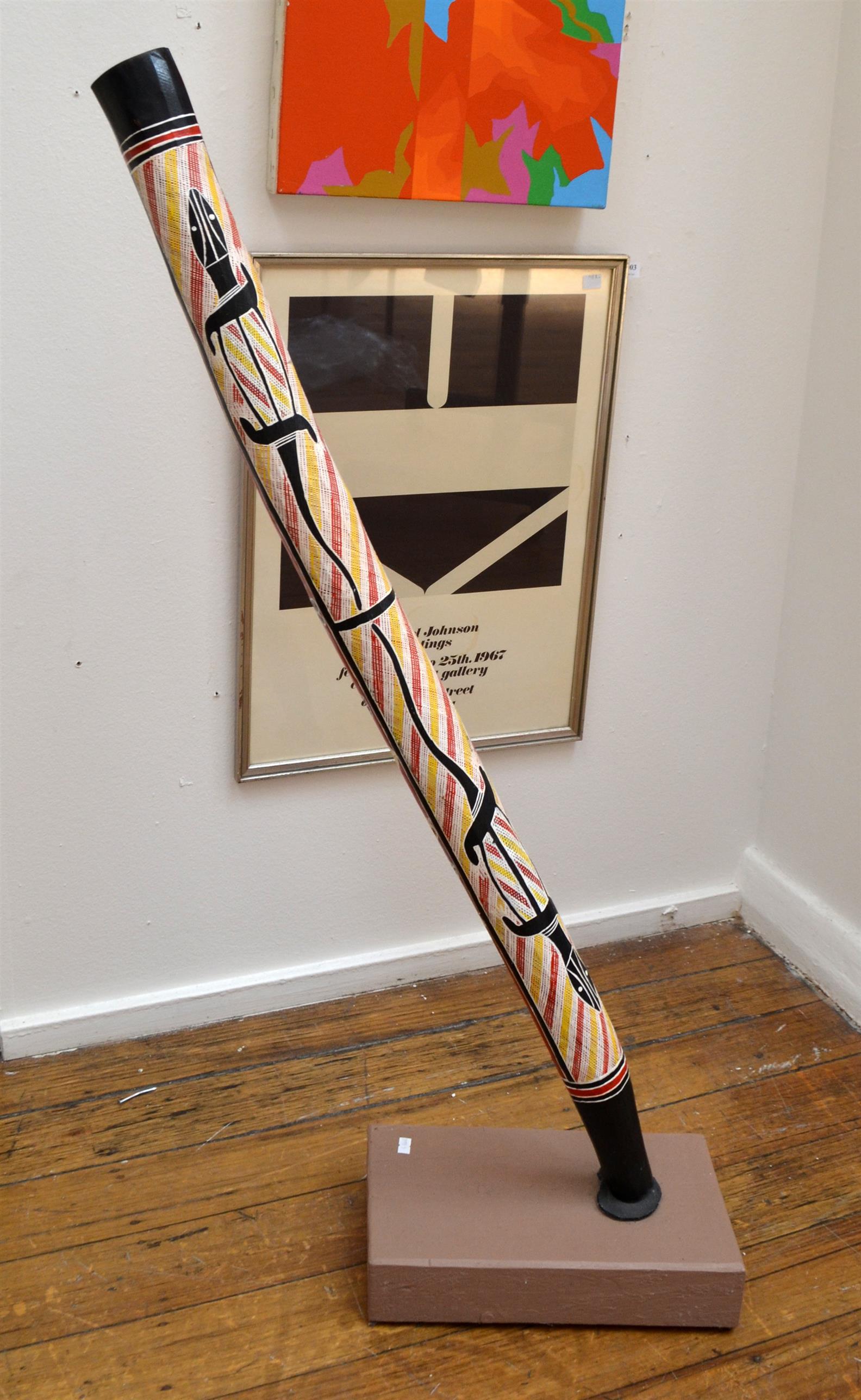 A DECORATIVE INDIGENOUS DIDGERIDOO WITH STAND, 116CM (LENGTH)