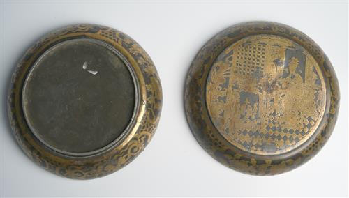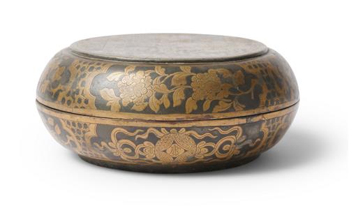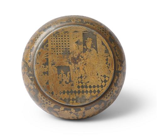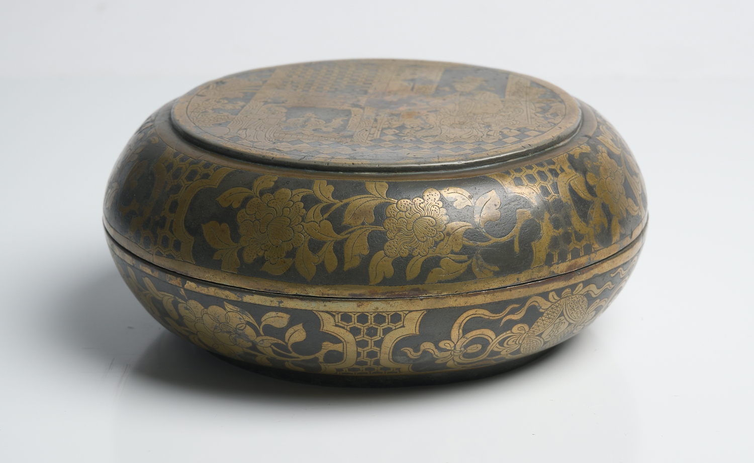 Finely decorated to the lid with an interior scene of a seated lady, surrounded by shaped reserves containing flowers against a tortoise-shall diaper ground.