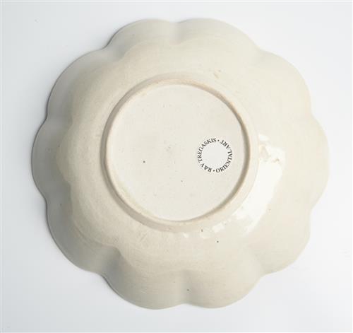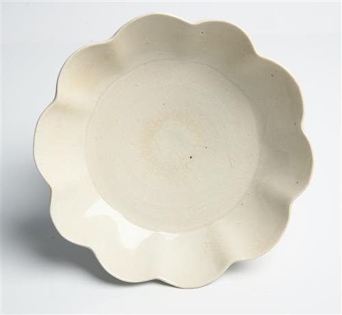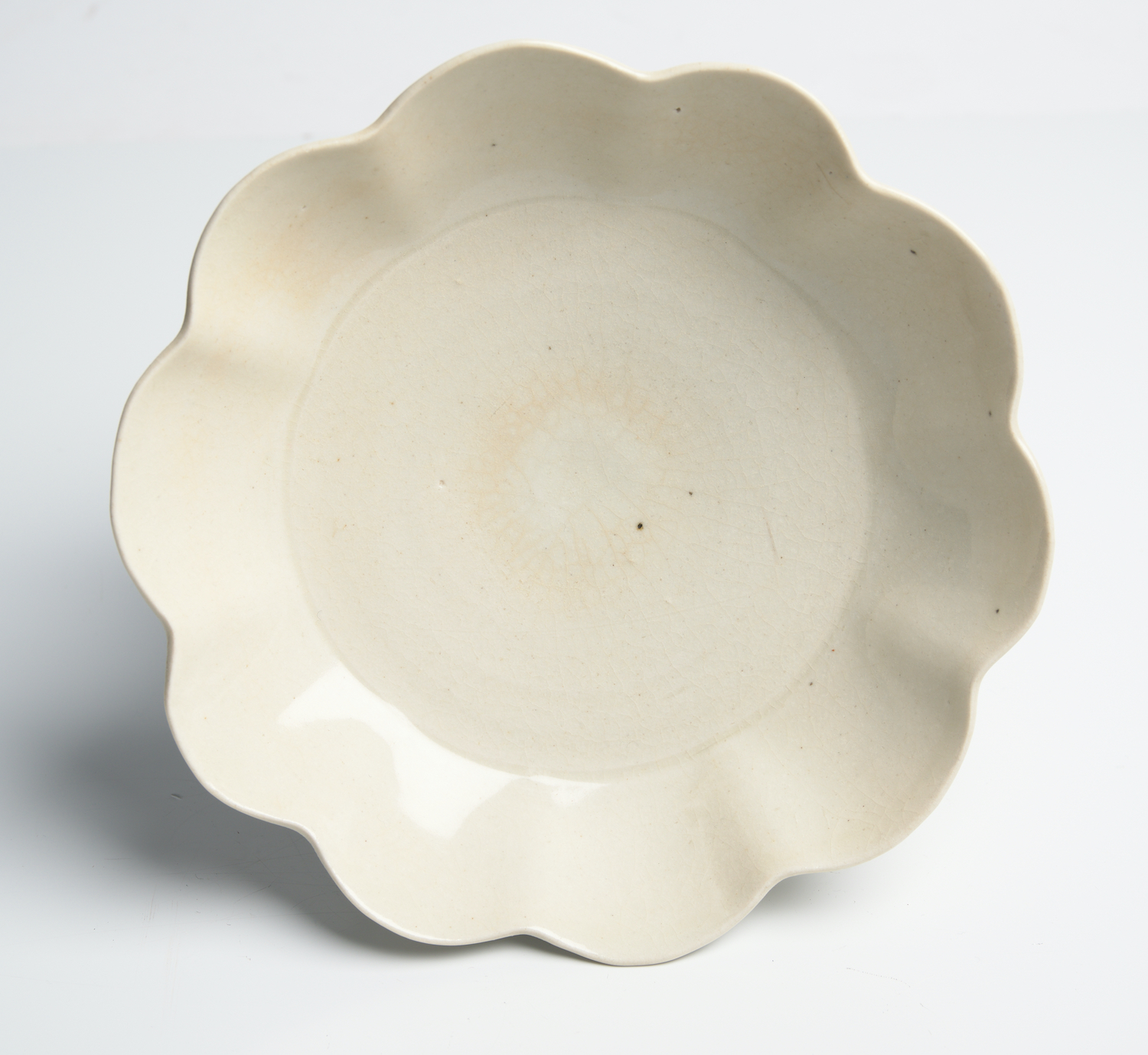 The chrysanthemum form dish with ten lobed to the rim, covered in an ivory-tinged crackled glaze.
