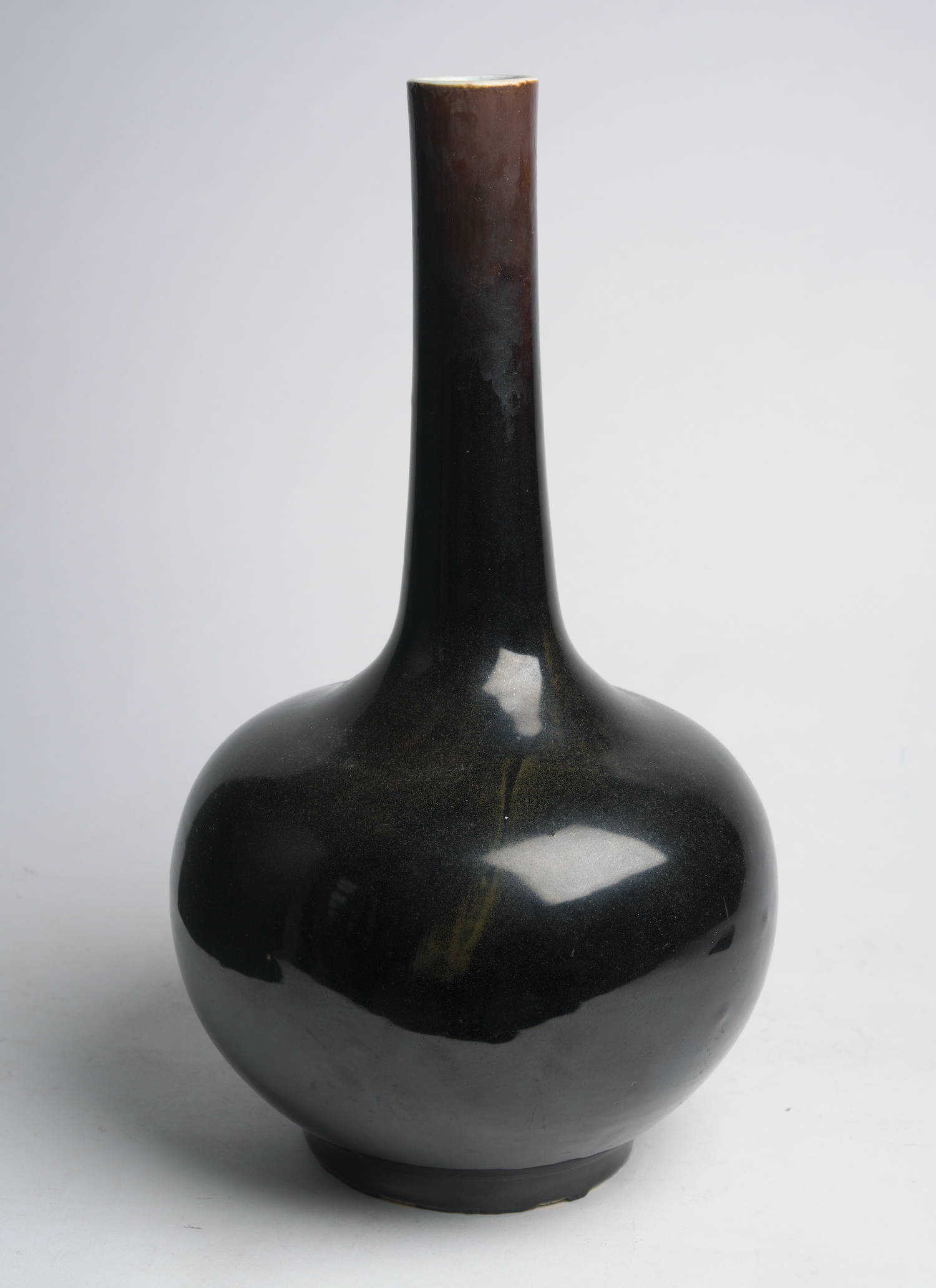 The long-necked porcelain vase covered in a deep black-brown glaze.