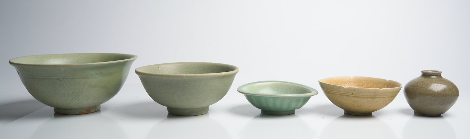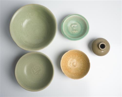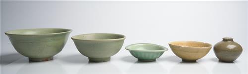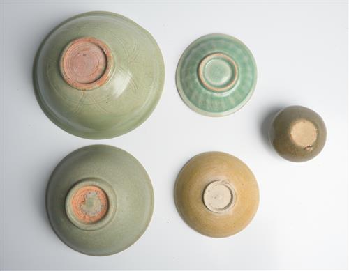 Comprising four bowls and a small jar, mostly from Longquan kilns. Two of the bowl exhibiting icy crackle to the glaze.
