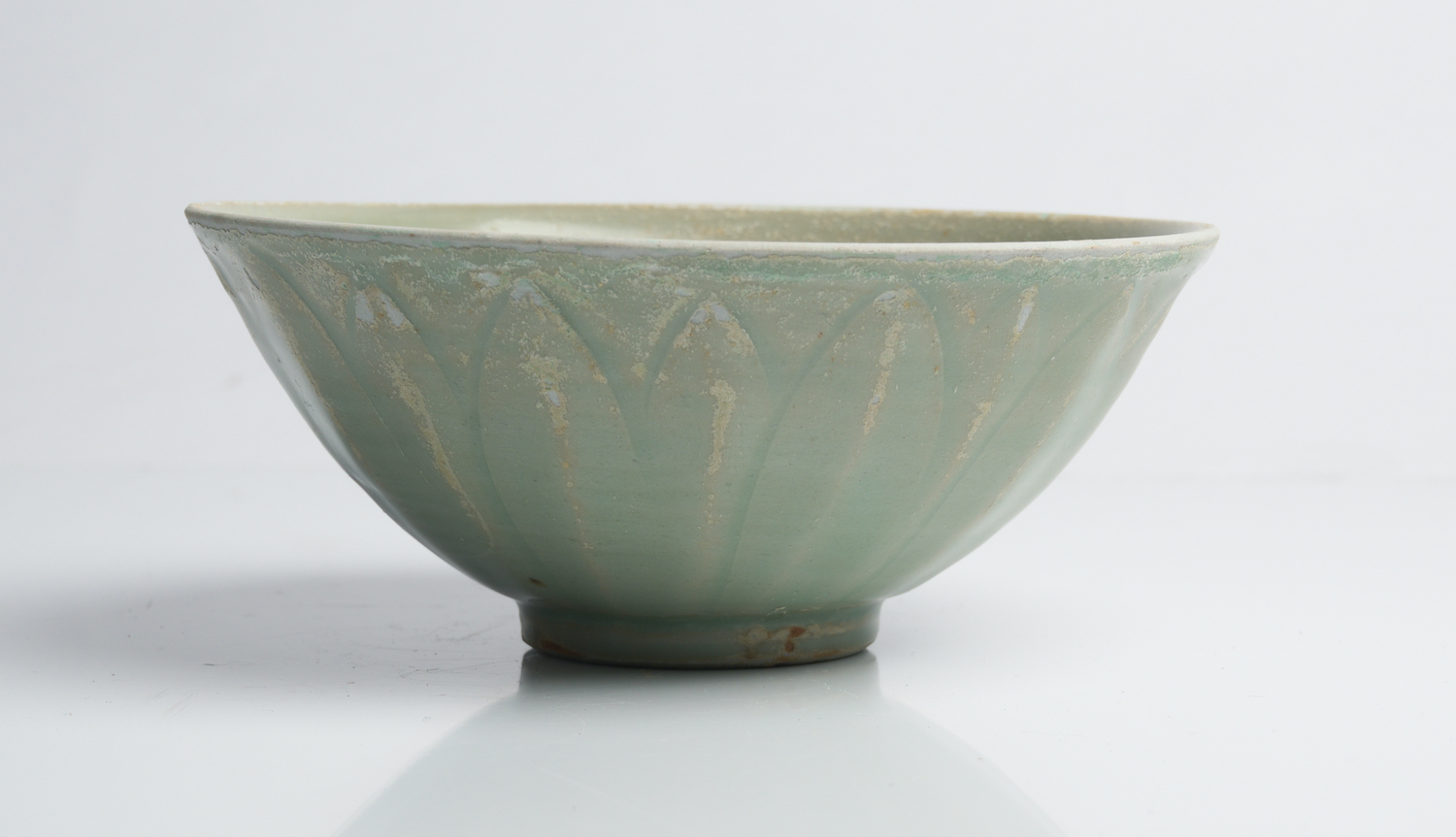 Finely carved to the exterior with lotus petals, covered in a pale celadon glaze over the grey stoneware body.