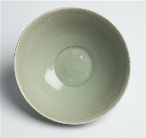 Glaze missing around the mouth-rim. Some small patches of glaze loss around the exterior. Crackle to the glaze in one section.