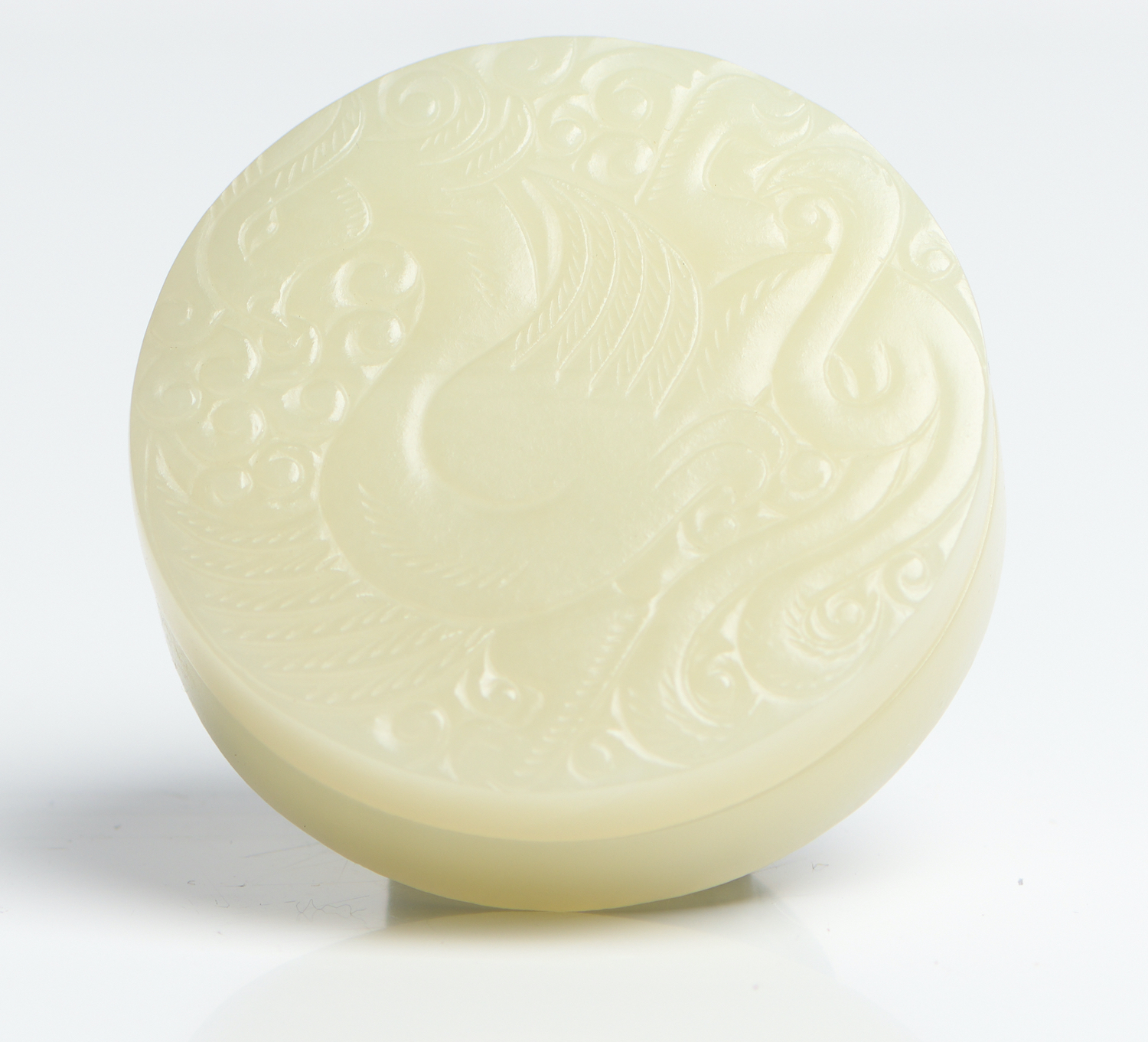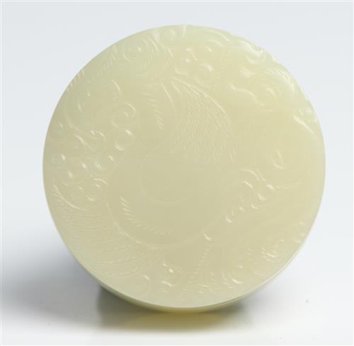 Of fine even colour, the top of the cover finely carved with a phoenix in flight amongst clouds.
