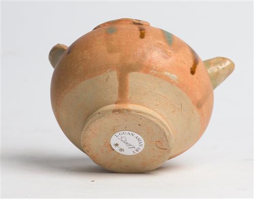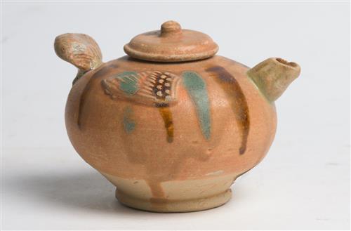 Modelled in the form of a rotund bird, with moulded applique wings, tail and a cylindrical spout, with brown and green splashed decoration.