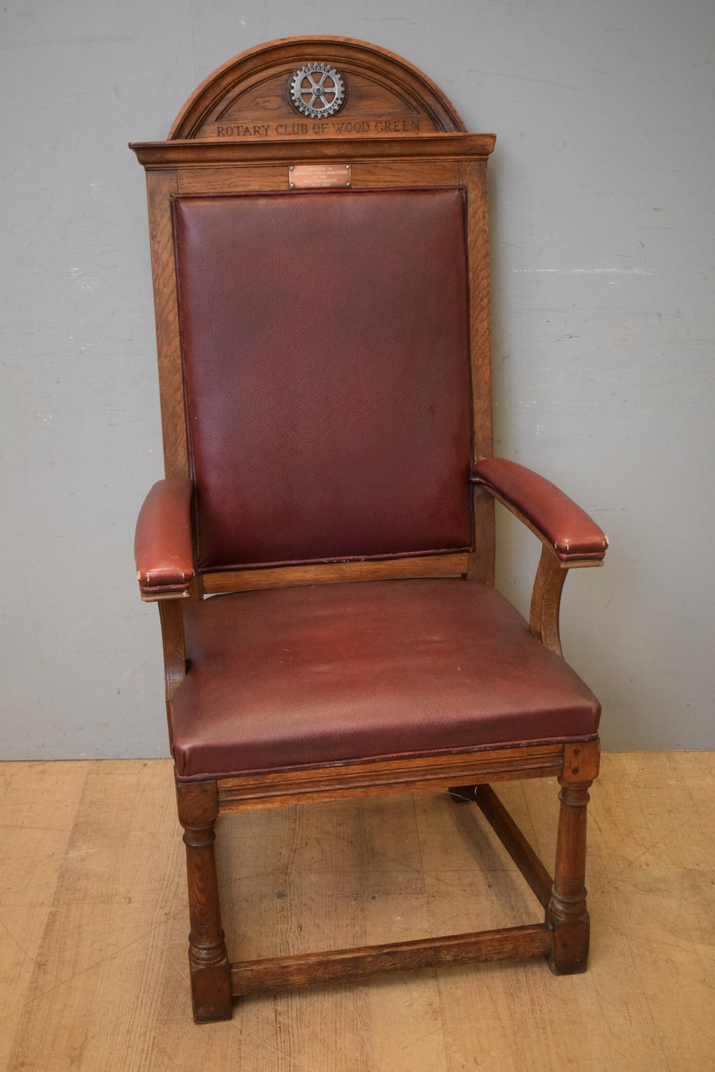 AN OAK ARMCHAIR FROM WOODGREEN ENGLAND PRESIDENT'S CHAIR (A/F) (138H x 62W x 64D CM) (LEONARD JOEL DELIVERY SIZE: LARGE)