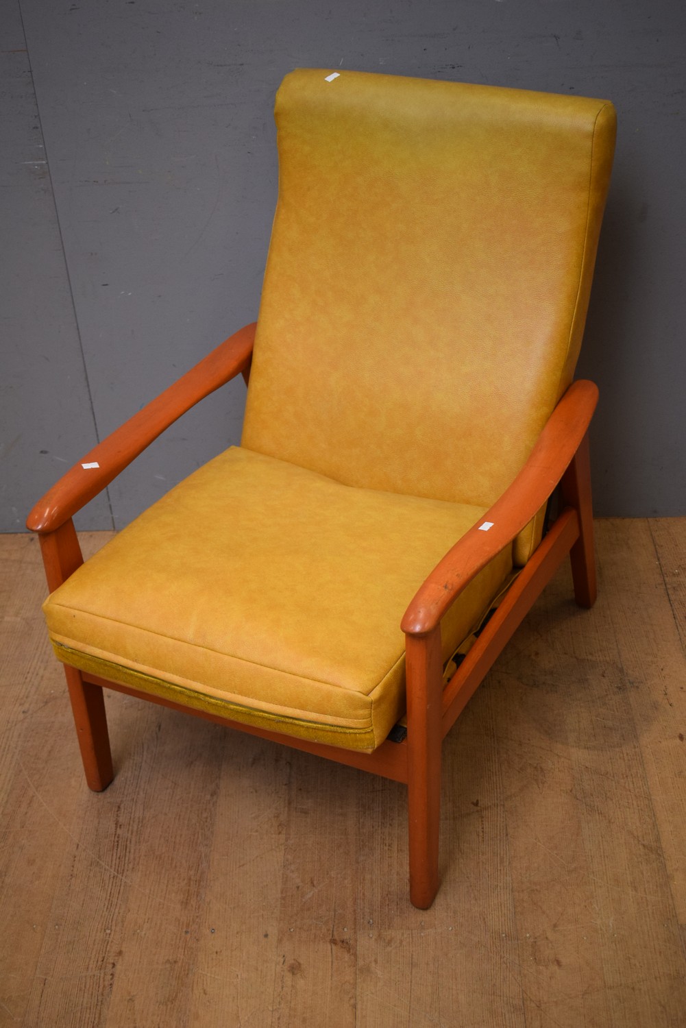 A MID-CENTURY YELLOW VINYL ARMCHAIR (A/F) (H88 X W64 X D77 CM) (LEONARD JOEL DELIVERY SIZE: MEDIUM)