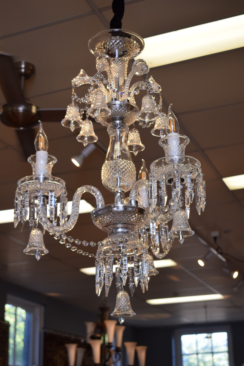 A THREE GLOBE HOBNAIL CUT CRYSTAL CHANDELIER (80H x 46D CM) (LEONARD JOEL DELIVERY SIZE: LARGE)