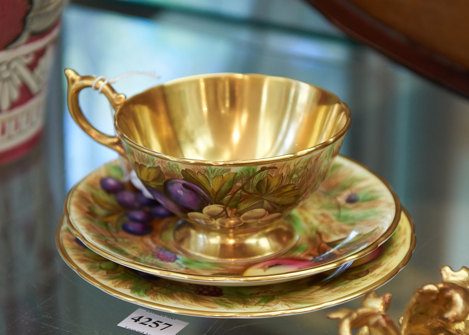 AN AYNSLEY GILT TRIO FRUIT DECORATION WITH CRYSTAL VASE AND TWO PLATESS, LEONARD JOEL LOCAL DELIVERY SIZE: SMALL