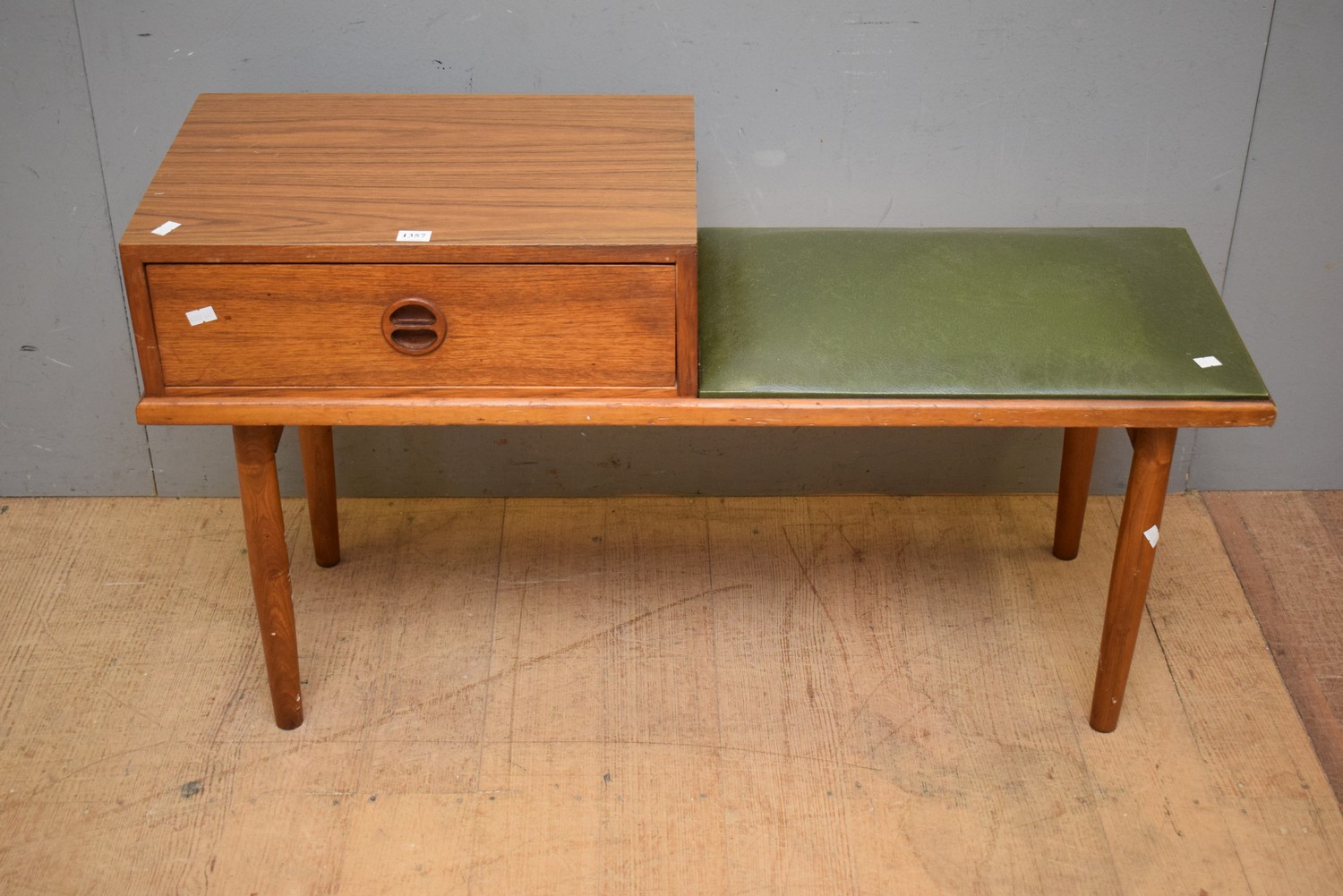 A RETRO AUSTRALIAN TEAK AND ORIGINAL GREEN VINYL SINGLE DRAWER TELEPHONE TABLE (50H x 92W x 32D CM) (LEONARD JOEL DELIVERY SIZE: MEDIUM)
