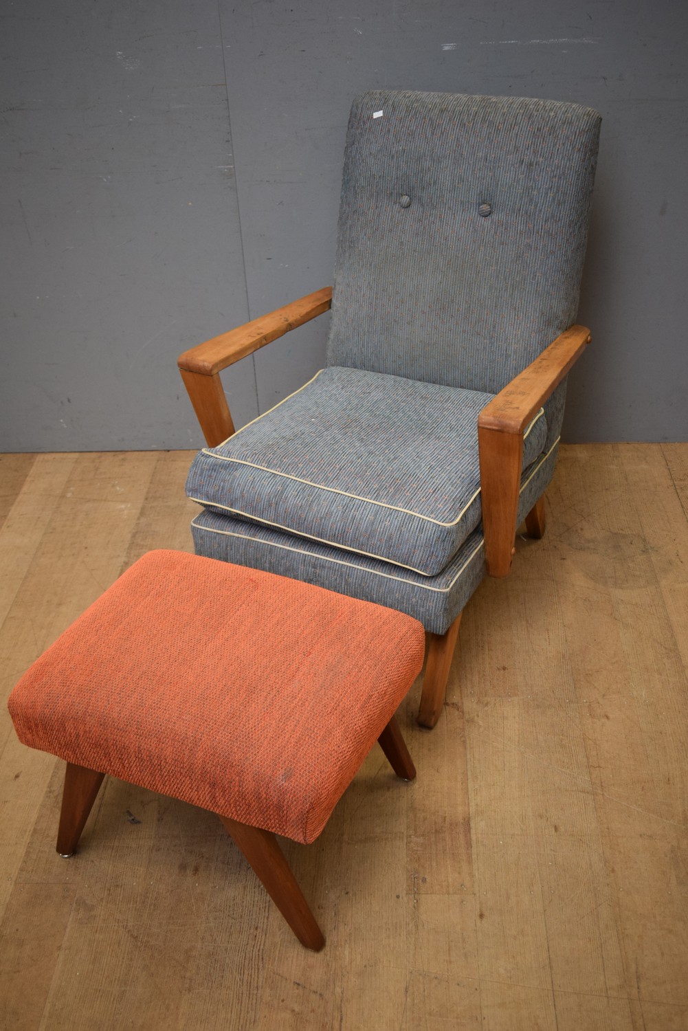 A 1950S AUSTRALIAN RETRO WOODEN AND UPHOLSTERED ARM CHAIR AND STOOL (H94 X W67 X D88 CM) (LEONARD JOEL DELIVERY SIZE: LARGE)