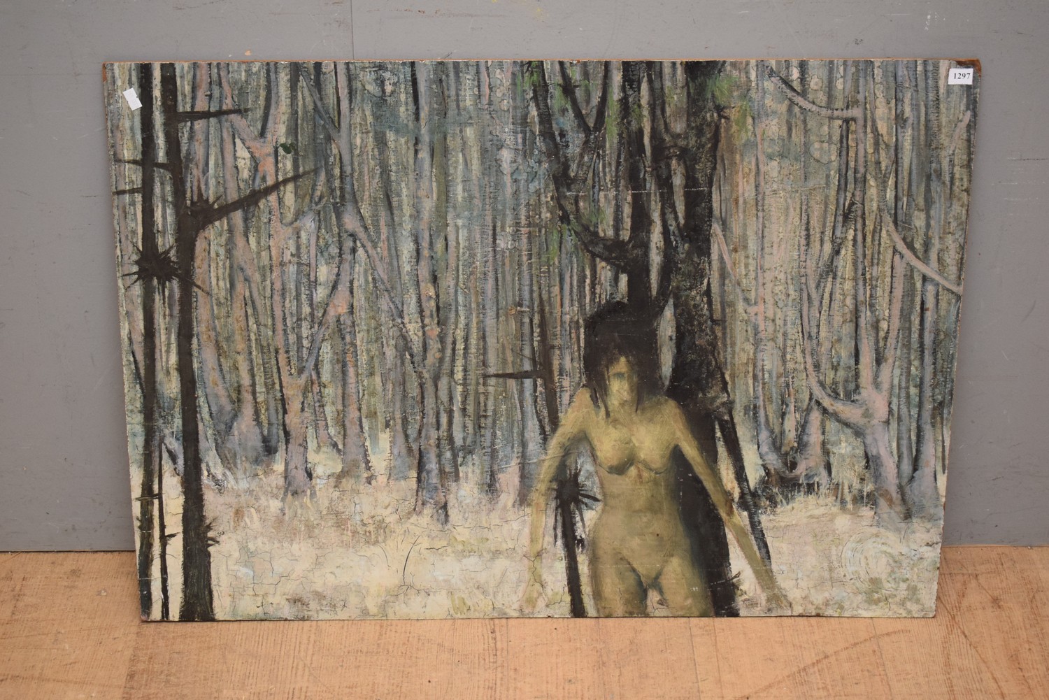 A 1950S AUSTRALIAN OIL ON BOARD - NAKED GIRL AMONGST SNOW LAIDEN LANDSCAPE (66H x 93W CM) (LEONARD JOEL DELIVERY SIZE: MEDIUM)