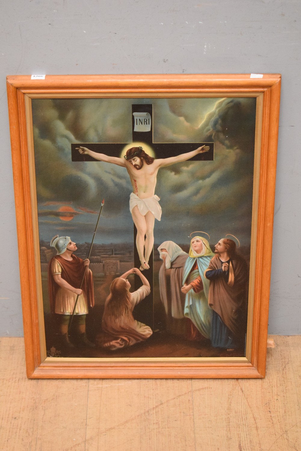 A WOODEN FRAMED HAND PAINTED RELIGIOUS SCENE OF JESUS ON CROSS (66H x 50W CM) (LEONARD JOEL DELIVERY SIZE: MEDIUM)