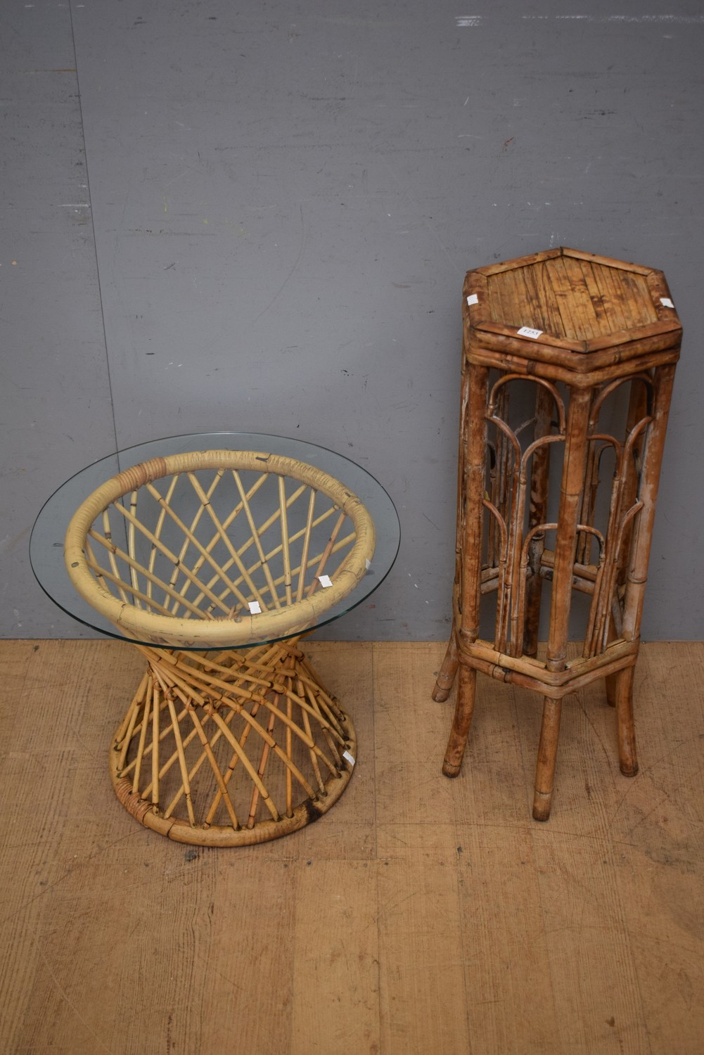 1950S GLASS TOPPED CANE CIRCULAR TABLE AND 1920S BAMBOO PLANT STAND (A/F) (72H x 30D CM) (LEONARD JOEL DELIVERY SIZE: MEDIUM)