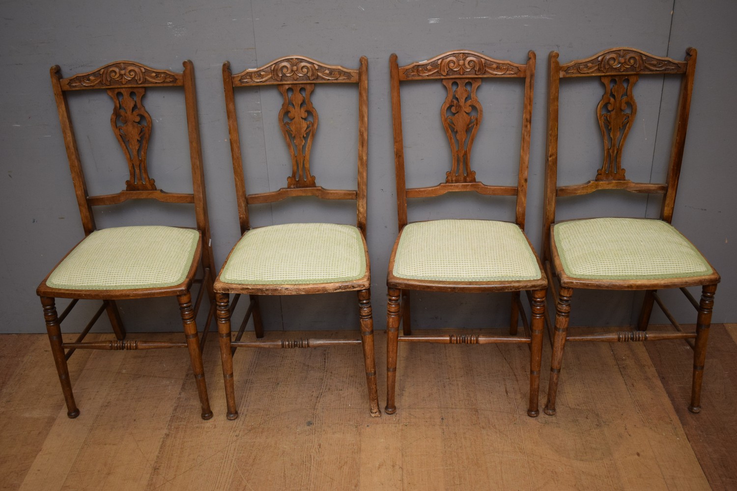 A SET OF FOUR CARVED TIMBER DINING CHAIRS (A/F) (H90 X W40 X D43 CM) (LEONARD JOEL DELIVERY SIZE: LARGE)