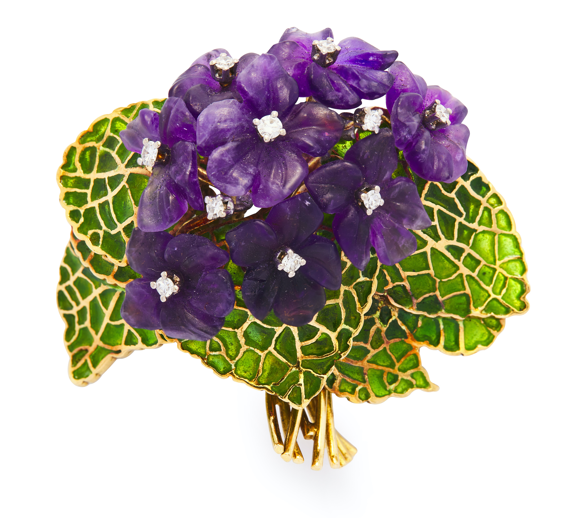 Designed as a floral bouquet, the petals modelled in carved amethyst, decorated at intervals with claw-set circular-cut diamonds, the foliage finished in plique-à-jour, one petal deficient, approximately 46mm x 32mm, maker's mark 'B'.