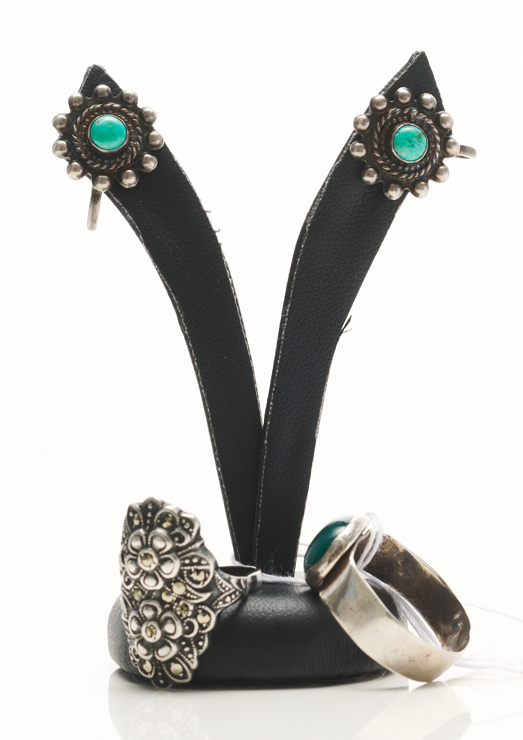 A COLLECTION OF SILVER JEWELLERY COMPRISING A PAIR OF TURQUOISE EARRINGS TO SCREW BACK FITTINGS AND TWO RINGS, RING SIZE F AND Q