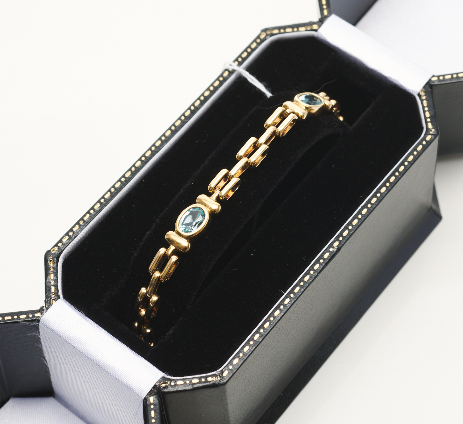 AN AQUAMARINE BRACELET IN 9CT GOLD, LENGTH 19CM, 11.9GMS