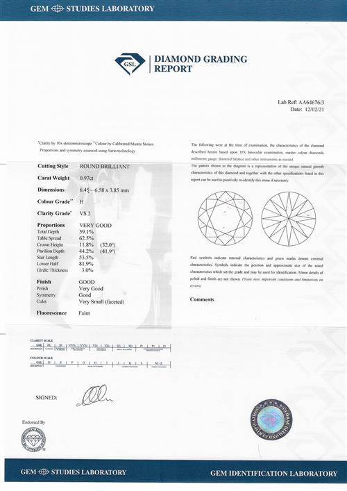 a GSL report numbered AA64676/3, dated 12 February 2021, stating that the 0.97 carat diamond is H colour, VS2 clarity.