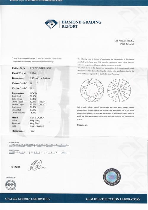 a GSL report numbered AA64676/2, dated 12 February 2021, stating that the 0.91 carat diamond is G colour, SI1 clarity;