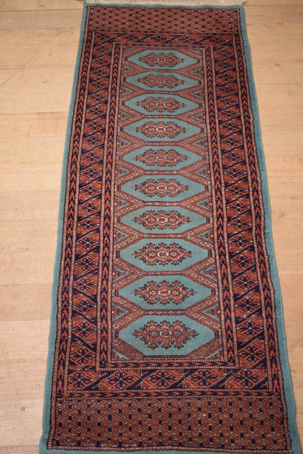 A PERSIAN HALL RUNNER IN GREEN TONES (A/F) (172 X 63 CM)
