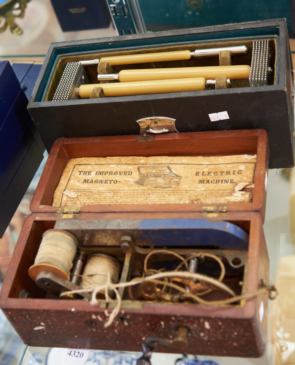 TWO VINTAGE QUACK MEDICINE MACHINES (A/F) INCLUDING 'THE IMPROVED MAGNETO MACHINE FOR NERVOUS DISEASES', LEONARD JOEL LOCAL DELIVERY SIZE: SMALL