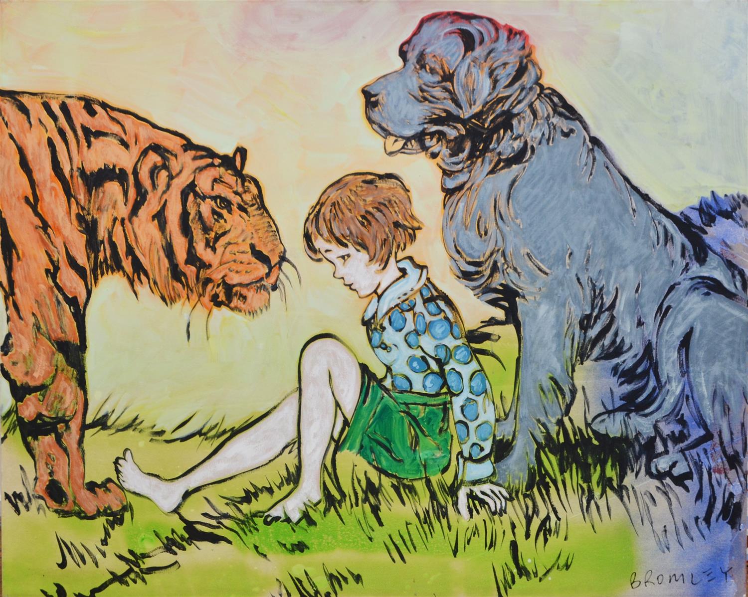DAVID BROMLEY, GIRL, DOG AND TIGER, OIL ON CANVAS, 121 X 153CM, LEONARD JOEL DELIVERY SIZE: LARGE, CONDITION: VERY GOOD
