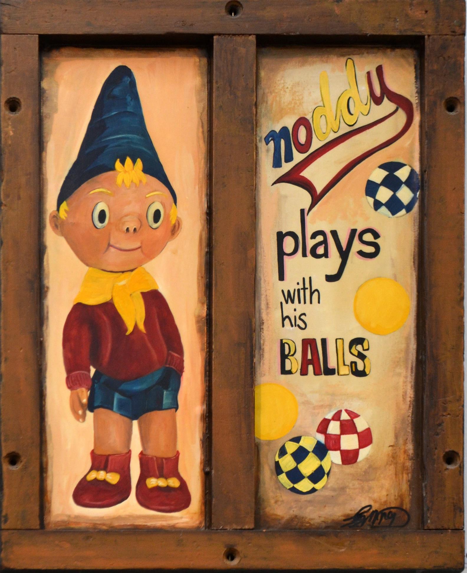 ARTIST UNKNOWN, NODDY PLAYS WITH HIS BALLS, MIXED MEDIA ON FOUND WOOD, 59 X 48CM, LEONARD JOEL DELIVERY SIZE: SMALL