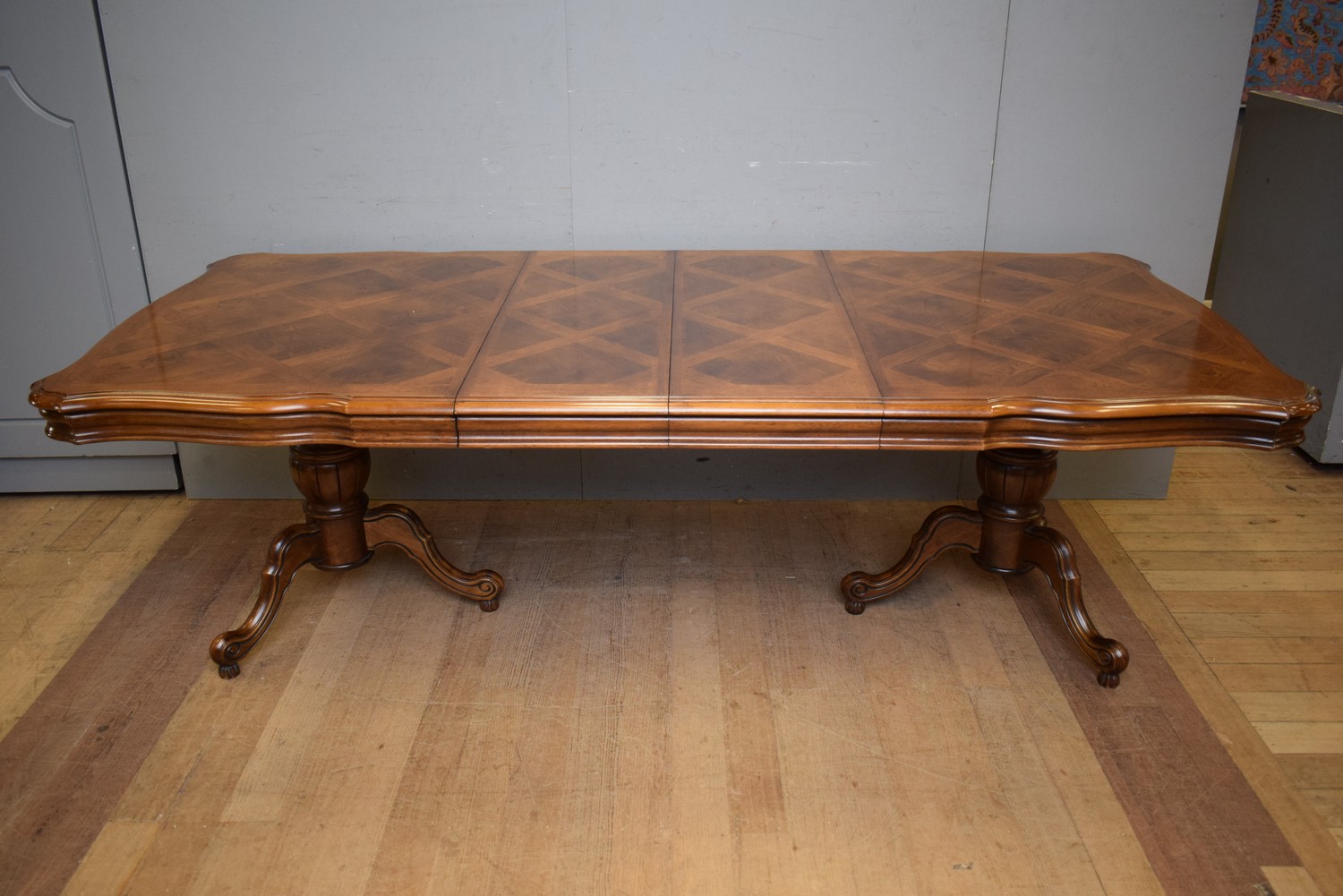 A FRENCH STYLE EXTENSION DINING TABLE WITH TWO LEAVES (H77 X W169 X D111 CM) (EXTENDED - W245 CM) (PLEASE NOTE THIS HEAVY ITEM MUST BE REMOVED BY CARRIERS AT THE CUSTOMER'S EXPENSE. LEONARD JOEL STAFF CANNOT ASSIST CARRYING THIS ITEM) (X-LARGE ITEM)