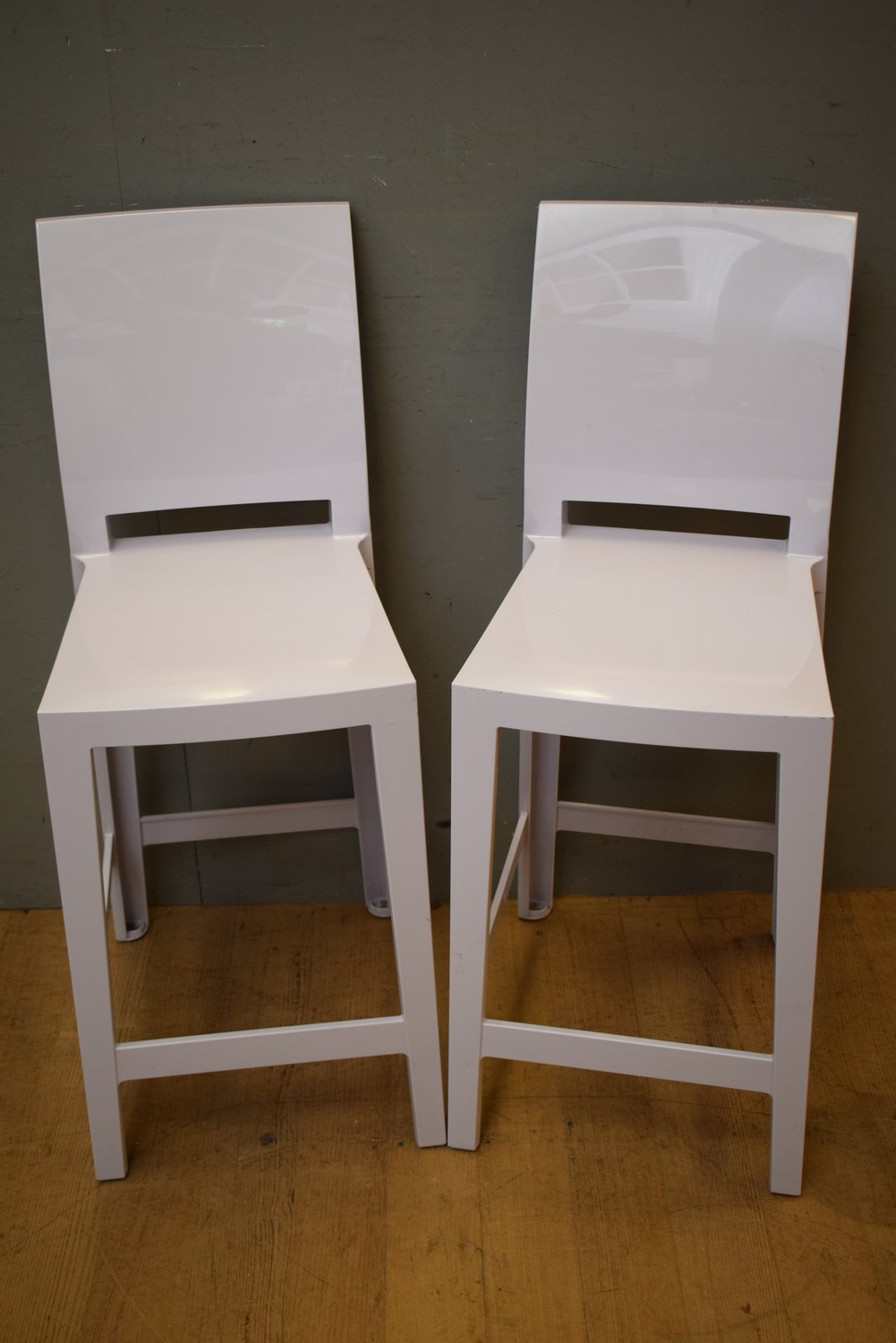 A PAIR OF WHITE KARTELL BAR STOOLS (A/F) (H100 X W38 X D45 CM) (LEONARD JOEL DELIVERY SIZE: MEDIUM)