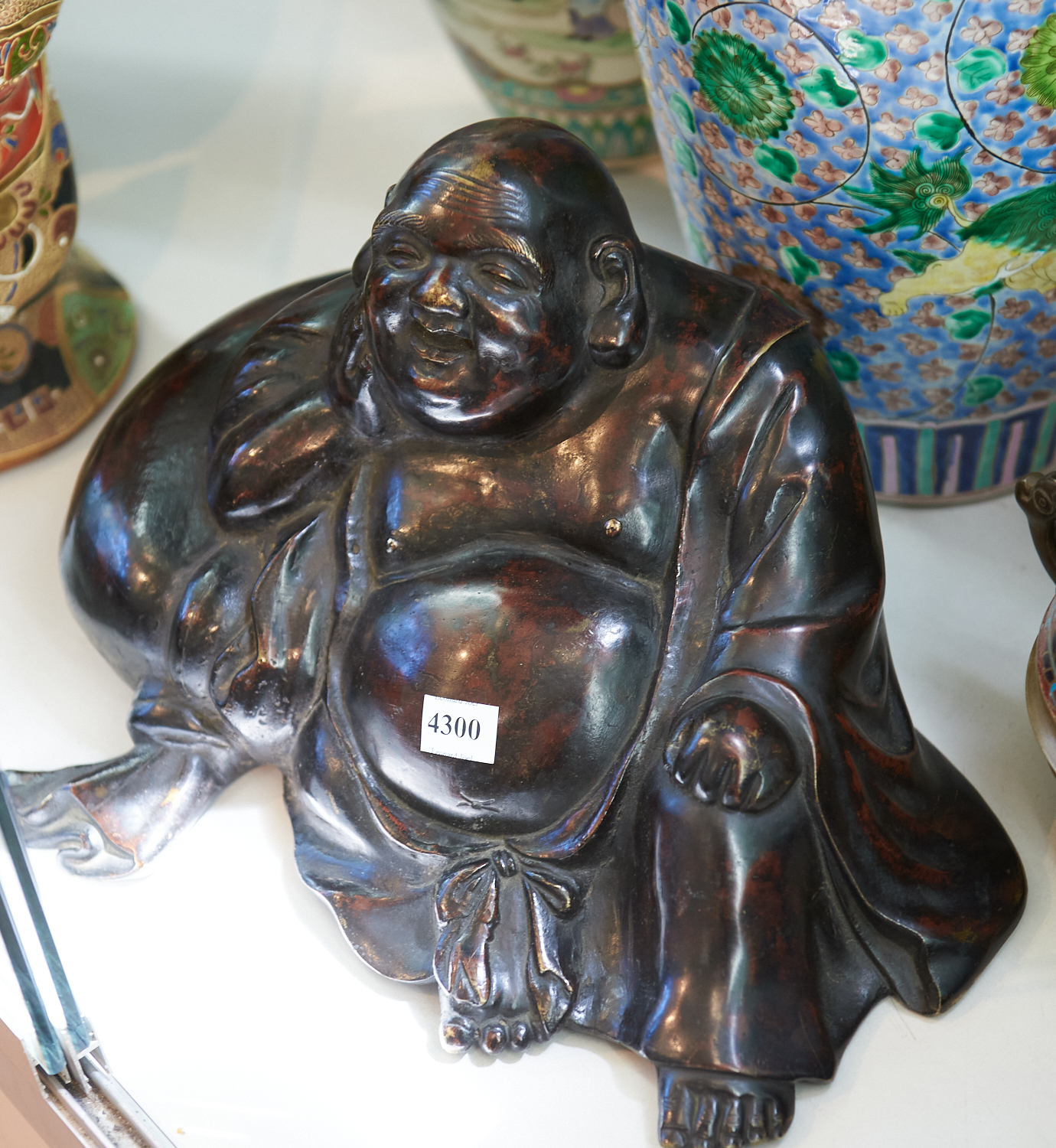 A BRONZE HAPPY BUDDHA FIGURE WITH MONEY SACK, LEONARD JOEL LOCAL DELIVERY SIZE: SMALL