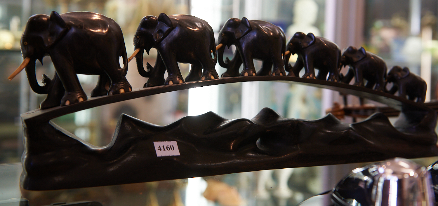 AN EBONY CEYLONESE ELEPHANT BRIDGE WITH BONE TUSKS W.50CM, LEONARD JOEL LOCAL DELIVERY SIZE: SMALL