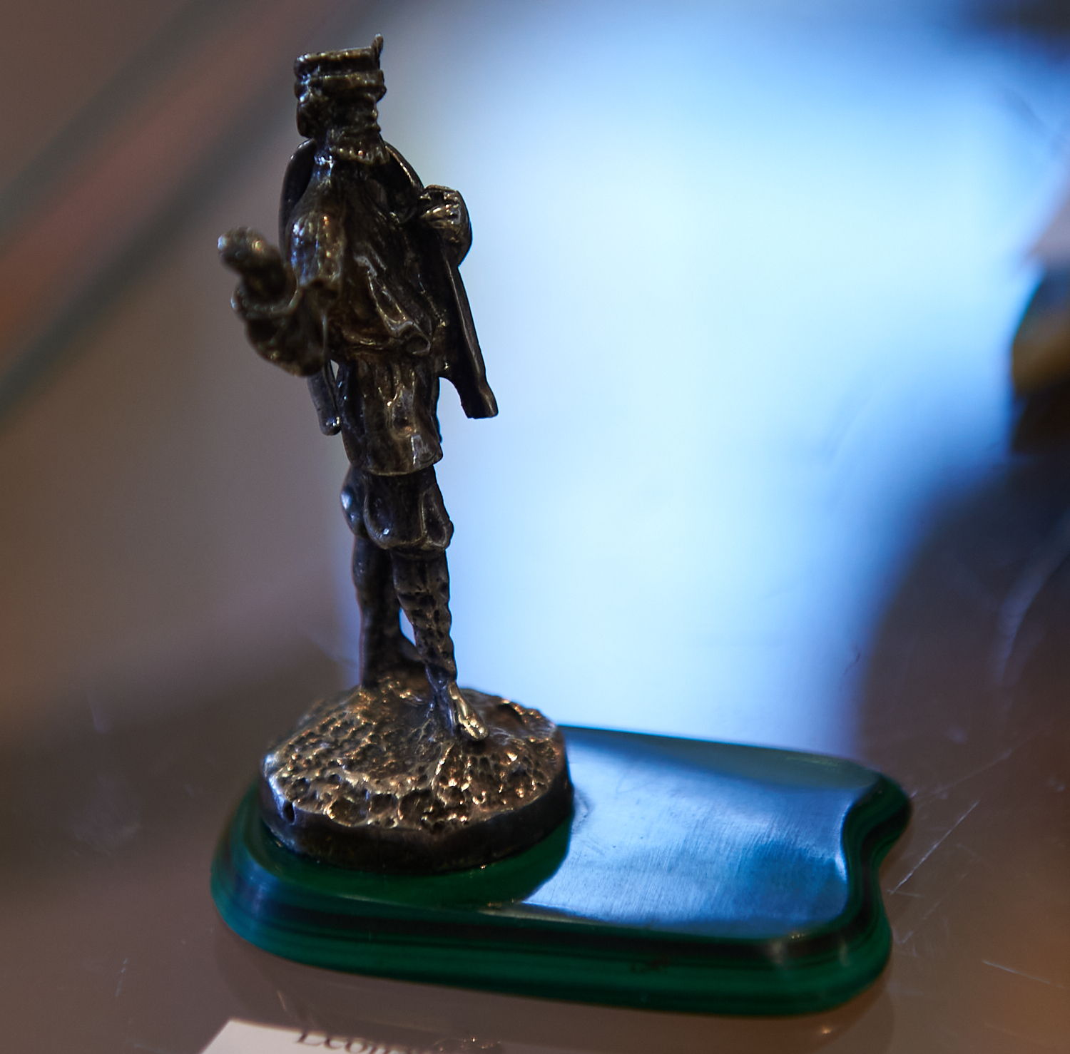 A FABERGE IMPERIAL RUSSIAN SILVER FIGURE OF A MAN IN TRADITIONAL RUSSIAN CLOTHING AFFIXED TO MALACHITE BASE, FABERGE MARK AT BASE, 88 SILVER, MOSCOW, 1908-1916 (A/F), LEONARD JOEL LOCAL DELIVERY SIZE: SMALL