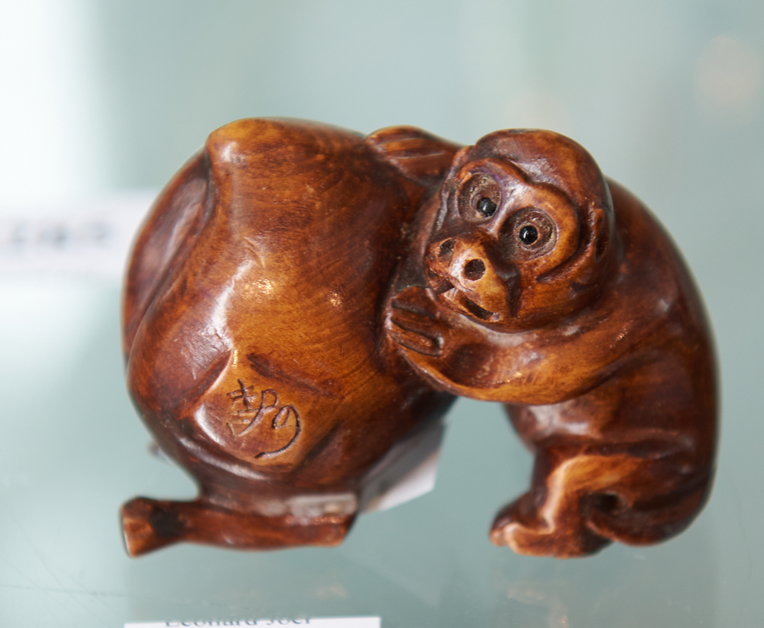 A JAPANESE CARVED BOXWOOD OKIMONO NETSUKE MONKEY AND PEACH, SIGNED, LEONARD JOEL LOCAL DELIVERY SIZE: SMALL