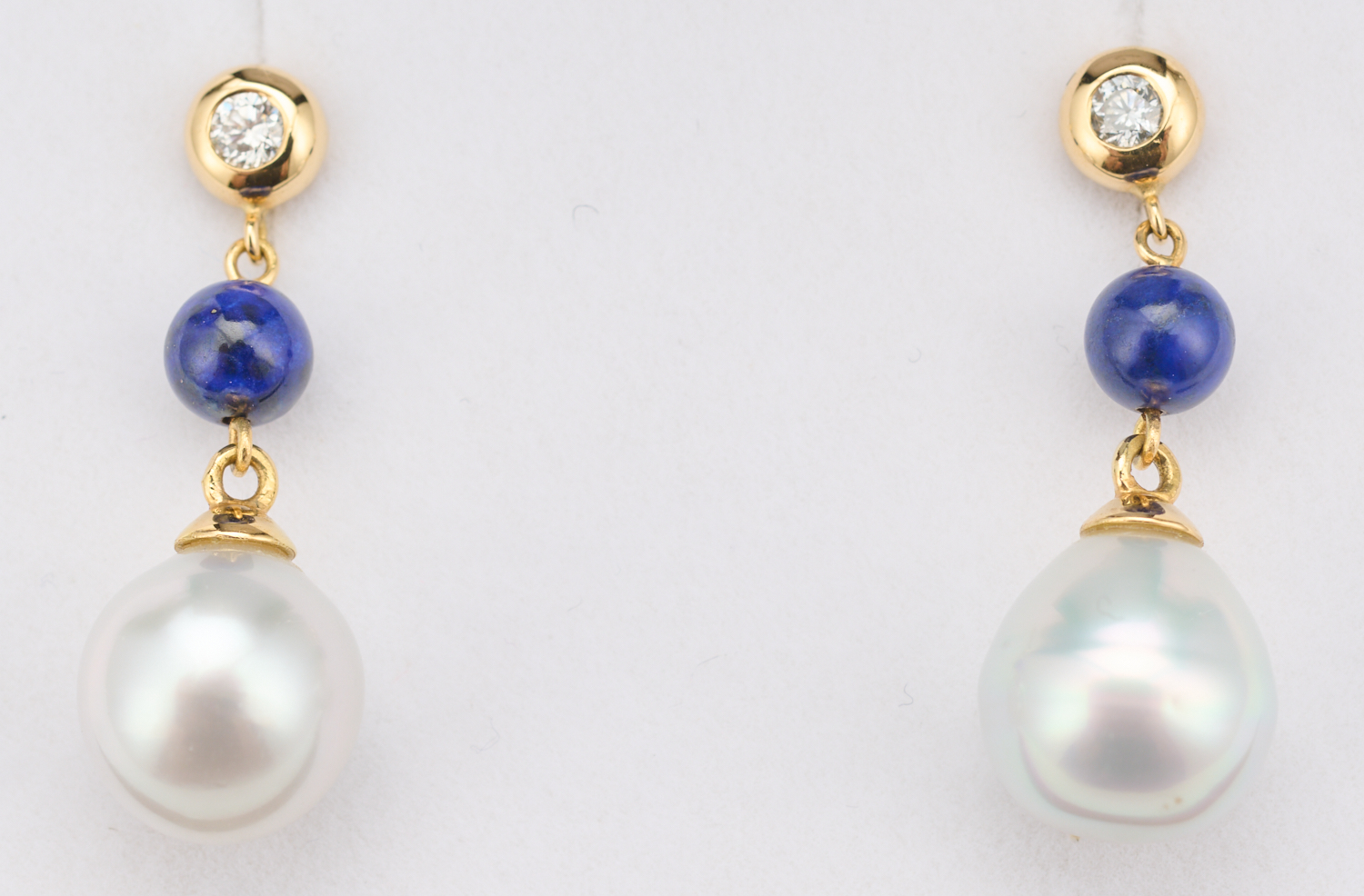 A PAIR OF LAPIS, YOUTH SEA PEARL AND DIAMOND EARRINGS IN 18CT GOLD, RETAILED BY RUTHERFORDS, BOXED