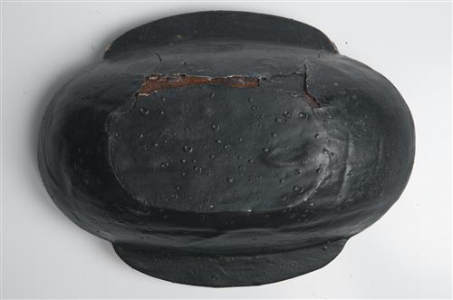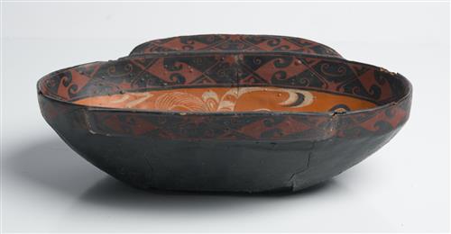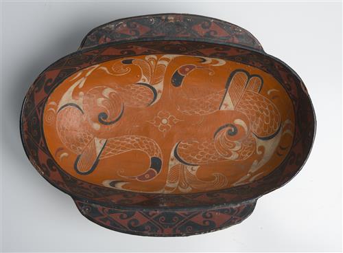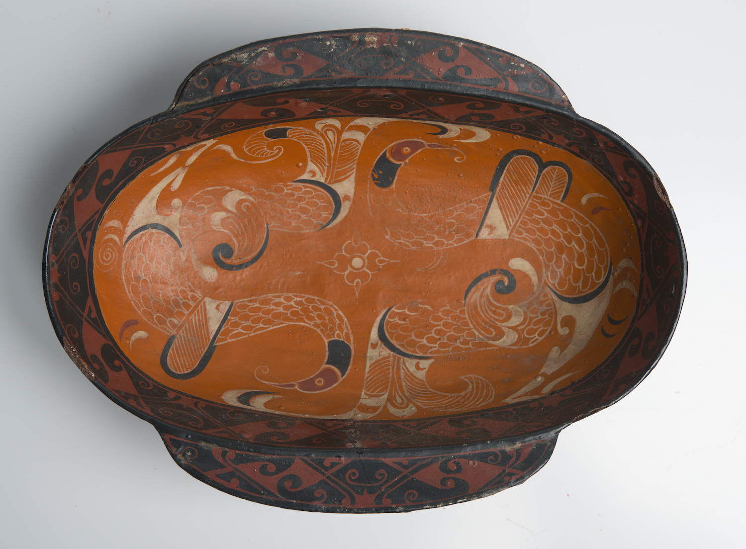 Painted to the interior with birds against an orange ground, to the borders with curvilinear abstracted archaic designs in red against a black ground. Possible later painting.