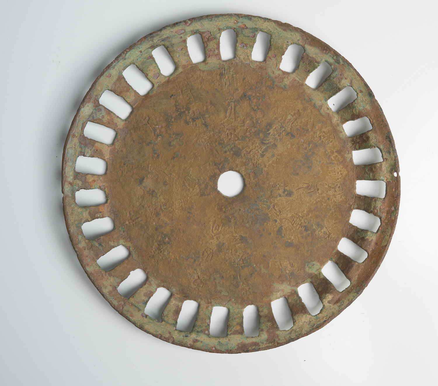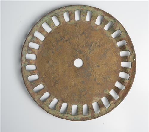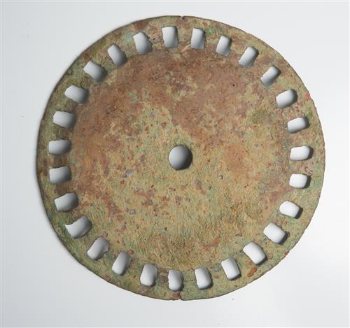 Fashioned as a disk with a raised and pierced rim and a hole to the centre, with an inscriotion in seal script surrounding the hole. The inscription is believed to be two poems, one by Huang Shan Kue and Li Yang Bin (active Tang Dynasty).