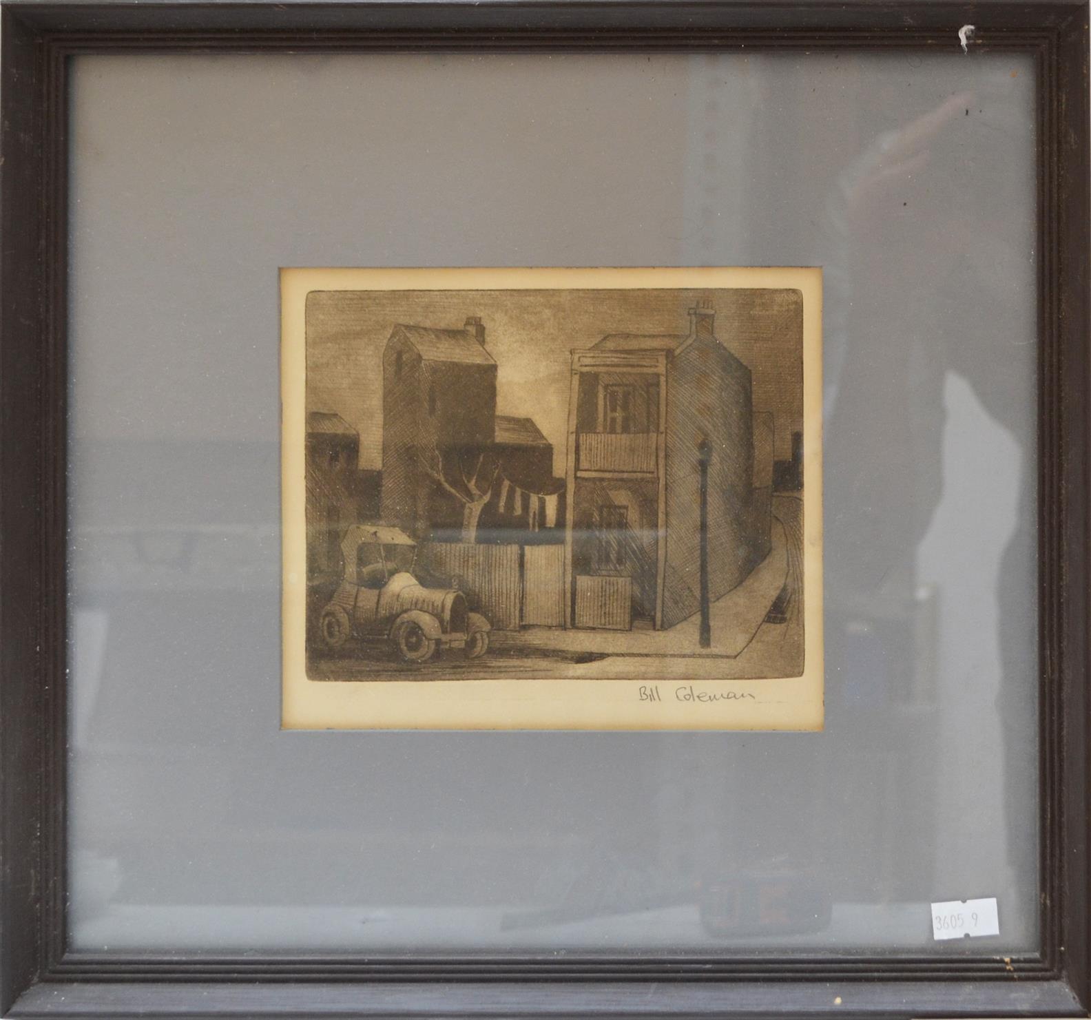 BILL COLEMAN, CAR AND HOUSE, ETCHING, 13 X 16CM, FRAME: 33 X 36CM, CONDITION: DISCOLOURATION, LEONARD JOEL DELIVERY SIZE: SMALL