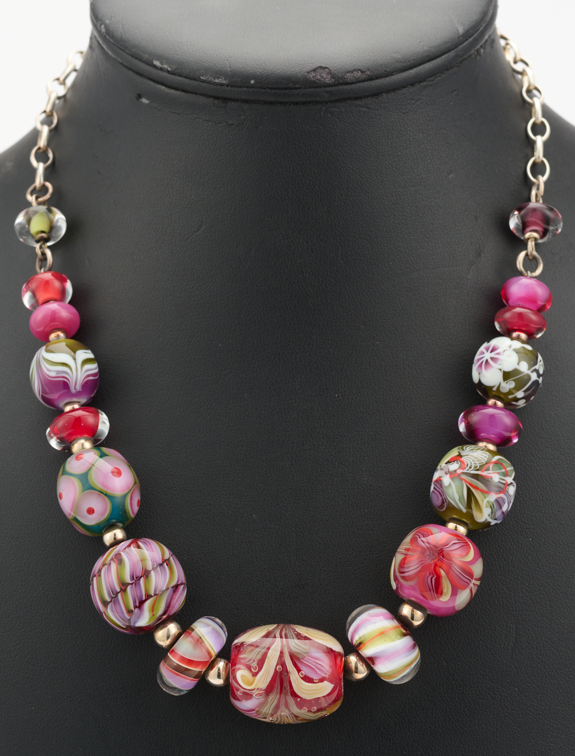 A GLASS BEAD NECKLACE WITH SILVER FITTINGS BY BY LIA SIMMONY