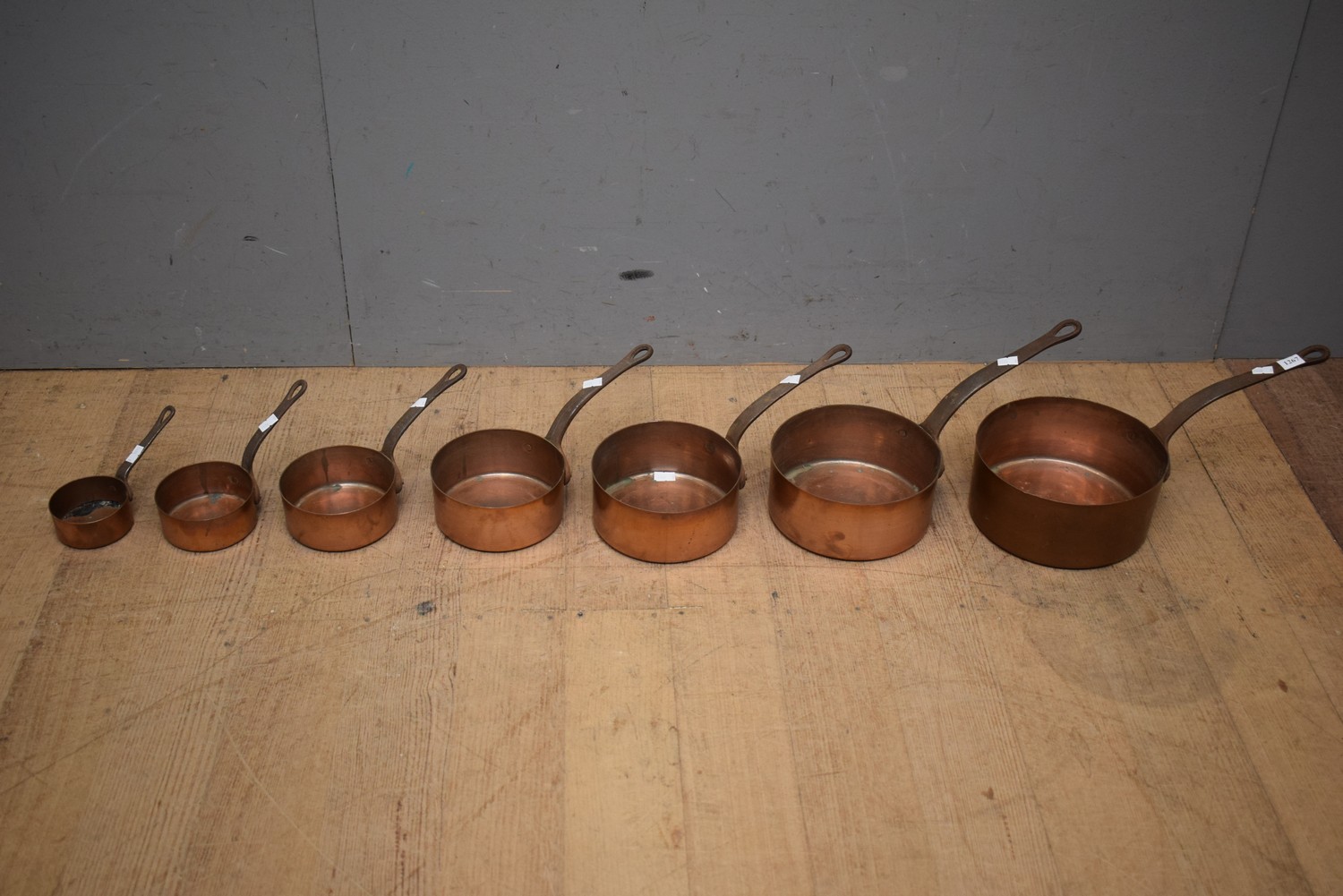 A SET OF SEVEN FRENCH COPPER SAUCEPANS (LARGEST 9H x 40D CM) (LEONARD JOEL DELIVERY SIZE: SMALL)