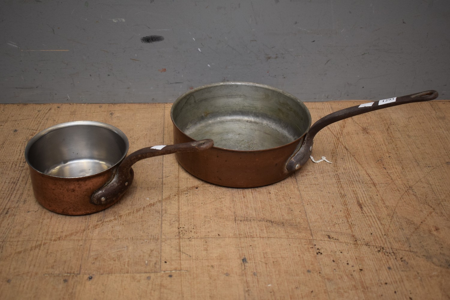 TWO FRENCH COPPER SAUCEPANS (19H CM) (LEONARD JOEL DELIVERY SIZE: SMALL)
