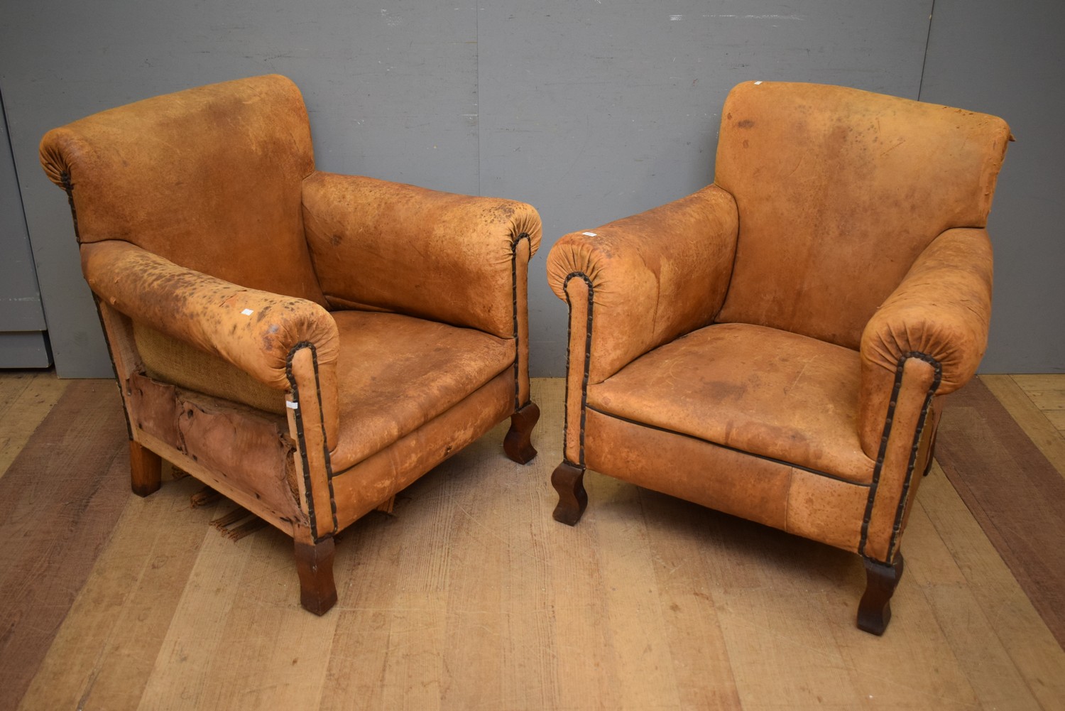 A PAIR OF ANTIQUE LEATHER ARMCHAIRS (A/F) (86H x 82W x 77D CM) (LEONARD JOEL DELIVERY SIZE: LARGE)