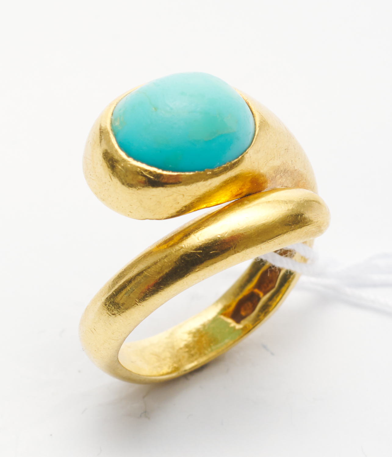A TURQUOISE SNAKE RING IN 18CT GOLD, SIZE I, 7GMS