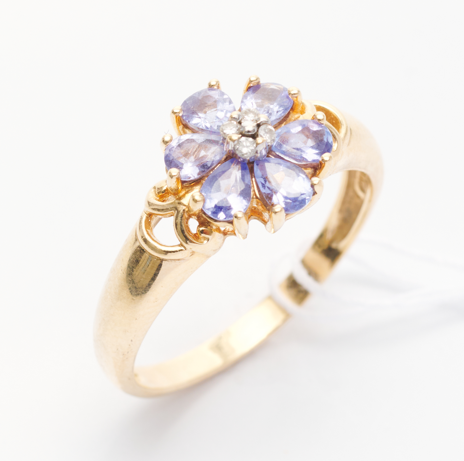 A TANZANITE AND DIAMOND FLORAL RING IN 14CT GOLD, SIZE R-S, 1.6GMS