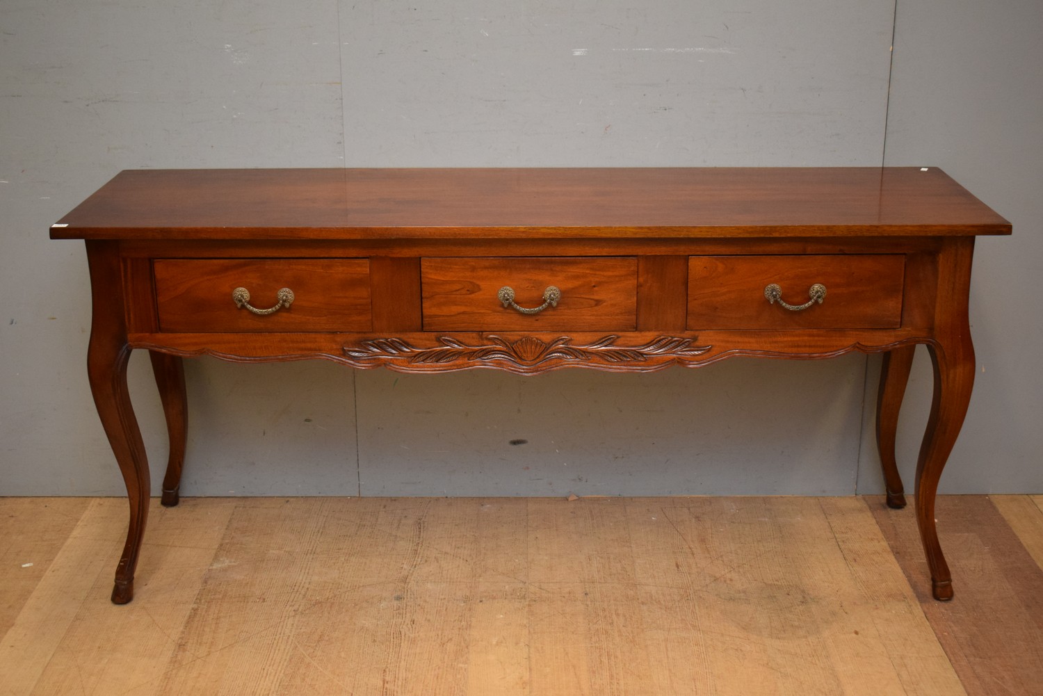 A PROVINCIAL STYLE MAHOGANY HALL CONSOLE WITH THREE DRAWERS (75H x 167W x 49D CM) (PLEASE NOTE THIS HEAVY ITEM MUST BE REMOVED BY CARRIERS AT THE CUSTOMER'S EXPENSE. LEONARD JOEL STAFF CANNOT ASSIST CARRYING THIS ITEM) (X-LARGE ITEM)